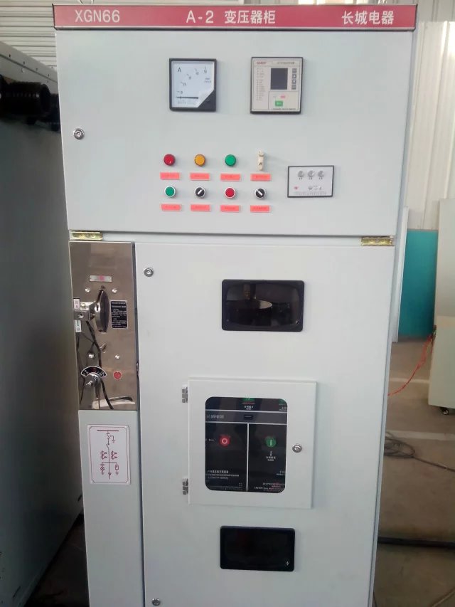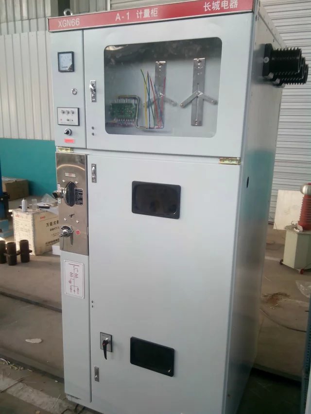 XGN66型開關(guān)柜為金屬封閉箱式外殼,所有帶電體均被封閉在柜內(nèi),并按功能劃分為母線室、斷路器室、電纜室,室間以金屬防護板分隔。儀表箱為單獨結(jié)構(gòu),安裝在柜上部,轉(zhuǎn)動箱后的絲杠,可使其升高300mm,以便于檢修斷路器部分。主母線由柜間的絕緣套管固定,卸下后蓋板即可檢修,此套管使相鄰兩柜間完全隔離,母線室頂蓋板上設(shè)有釋壓窗。真空斷路器及電磁操作機構(gòu)或彈簧操作機構(gòu)為一整體車式結(jié)構(gòu),推入柜內(nèi)后用螺栓固定。斷路器室與主母線室之間安裝上隔離開關(guān),與電纜室之間安裝下隔離開關(guān)。斷路器室的后壁安裝電流互感器,右側(cè)設(shè)有上下隔離開關(guān)及其接地開關(guān)的操動機構(gòu),本室內(nèi)如產(chǎn)生過高壓力,可經(jīng)后上方的釋壓窗排出。電纜由柜底板下部的支架和卡箍固定,穿過零序互感器進入柜內(nèi),用蓋板及填充物封嚴。電纜室高度900mm,可安裝三根240mm的電纜,電纜芯線連接到匯流銅排上,這個銅排用帶電顯示裝置的傳感器支撐,可以檢查電纜是否帶電。電纜室內(nèi)根據(jù)需要可以安裝避雷器,后下方設(shè)有接地母線,右下方是電纜頭接地開關(guān)的操作機構(gòu)。本室內(nèi)如產(chǎn)生過高壓力,可經(jīng)后部通道由上部的釋壓窗排出??諗嗦菲鞑捎锰沾蓺ら_關(guān)管,其外表面為波紋狀,爬電距離在210mm以上。相間中心距為230mm,空氣電氣間隙在125mm以上,電磁操作機構(gòu)采用半軸脫扣式四連桿機構(gòu),以直流電源驅(qū)動電磁鐵實現(xiàn)合閘、分閘。彈簧操作機構(gòu)是按引進比利時EIB公司技術(shù)生產(chǎn)的,以直流或交流電源驅(qū)動電動機使彈簧儲能,然后以電磁鐵使彈簧釋能,實現(xiàn)合閘,再以電磁鐵使機構(gòu)脫扣,實現(xiàn)分閘。上隔離開關(guān)采用GN30型旋轉(zhuǎn)式隔離開關(guān),附有接地刀。下隔離開關(guān)采用GN24型,附有接地刀。相間中心距均為230mm,所用電瓷件爬電距離均在210mm以上。